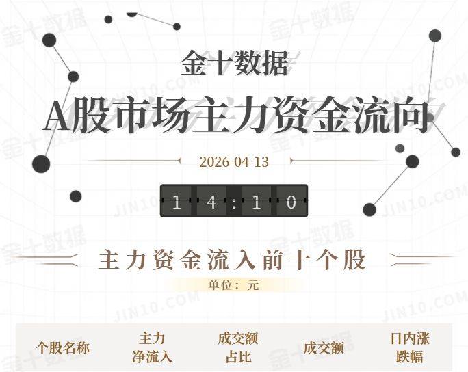 金十数据4月13日讯,截至2026年04月13日(周一)14:10,海光信息获主力资金净流入8.70亿元居首位,其次分别是寒武纪(8.59亿元)、二六三(6.90亿元)、比亚迪(6.69亿元)、中材科技(6.56亿元)、紫光股份(6.18亿元)、太辰光(5.97亿元)、华工科技(5.63亿元)、隆基绿能(5.37亿元)、盛新锂能(5.07亿元);主力资金流出规模居首的个股是亨通光电(-16.82亿元),其次是东山精密(-13.14亿元)、烽火通信(-10.03亿元)、工业富联(-9.13亿元)、长飞光纤(-9.13亿元)、立讯精密(-8.52亿元)、新易盛(-8.04亿元)、天孚通信(-7.55亿元)、兆易创新(-7.49亿元)、欣旺达(-6.20亿元)。