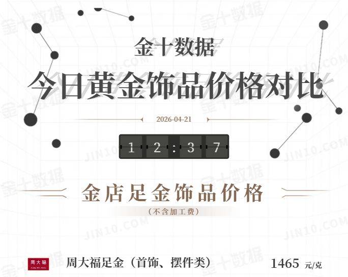 金十数据4月21日讯,今日国内黄金饰品价格对比显示,多家品牌金饰价格较此前变化不大,多数报价仍在1460元/克-1465元/克的区间。其中,周生生足金饰品报价最高,为1469元/克。