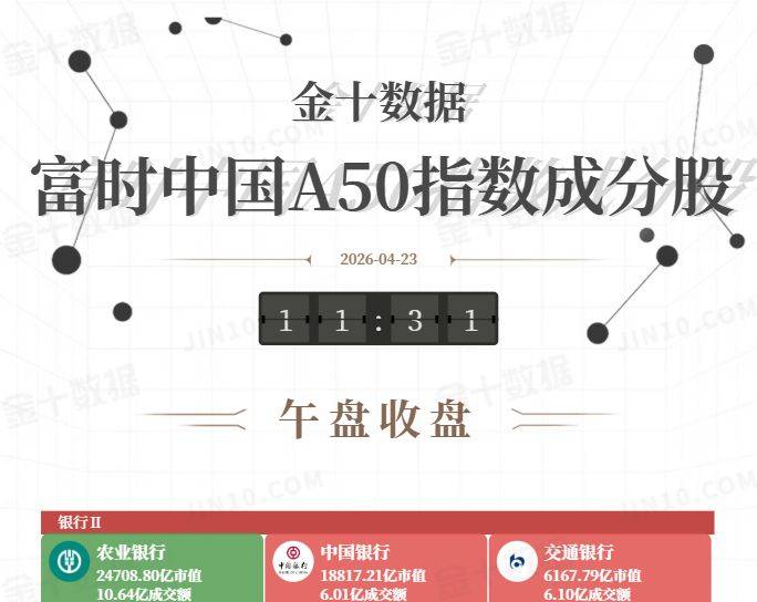 金十图示:2026年04月23日(周四)富时中国A50指数成分股午盘收盘行情一览:白酒板块走高,银行、半导体板块涨跌不一