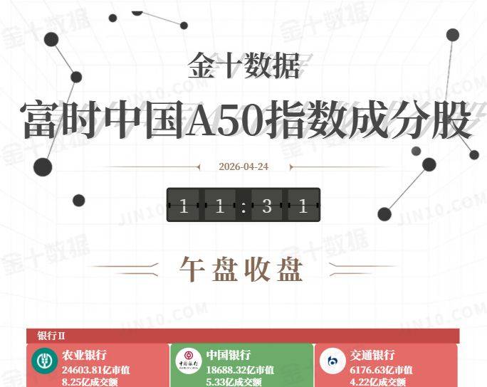 金十图示:2026年04月24日(周五)富时中国A50指数成分股午盘收盘行情一览:通信设备、工业金属板块全线走低,银行板块涨跌不一