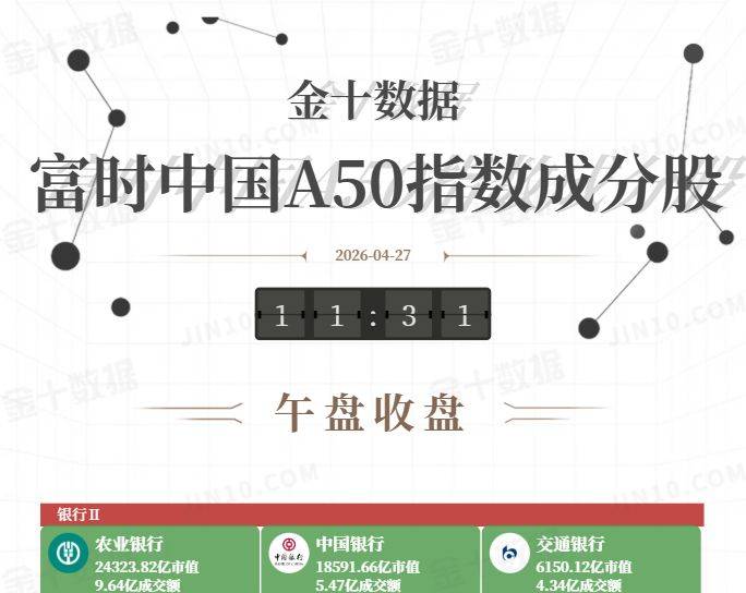 金十图示:2026年04月27日(周一)富时中国A50指数成分股午盘收盘行情一览:银行板块涨少跌多,半导体、消费电子板块走高。