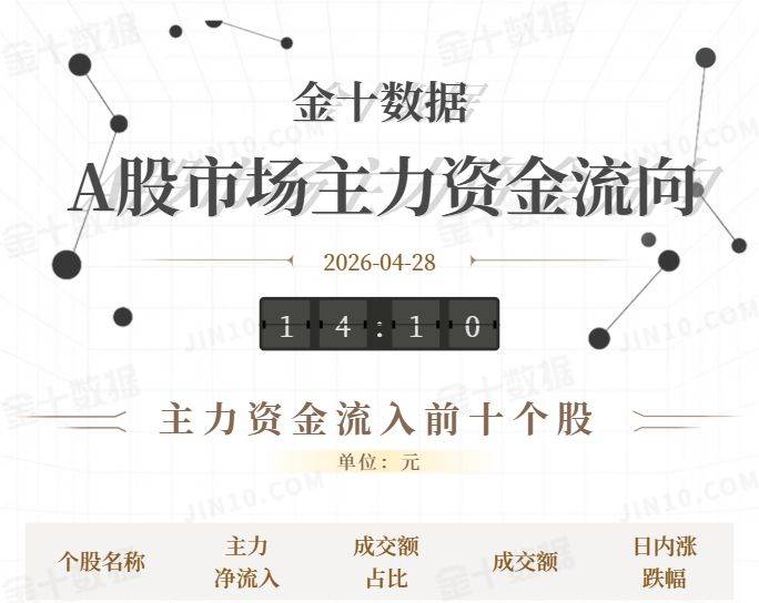 金十数据4月28日讯,截至2026年04月28日(周二)14:10,中国长城获主力资金净流入14.05亿元居首位,其次分别是药明康德(13.49亿元)、中国船舶(10.05亿元)、工业富联(7.32亿元)、中信证券(6.52亿元)、华银电力(5.50亿元)、德明利(5.37亿元)、寒武纪(5.19亿元)、盈峰环境(4.93亿元)、东方财富(4.15亿元);主力资金流出规模居首的个股是中际旭创(-24.44亿元),其次是天孚通信(-14.41亿元)、立讯精密(-13.86亿元)、永鼎股份(-11.44亿元)、亨通光电(-9.60亿元)、拓维信息(-9.43亿元)、中天科技(-9.23亿元)、天赐材料(-7.64亿元)、江波龙(-7.52亿元)、中芯国际(-6.33亿元)。